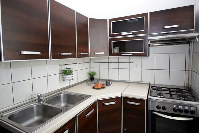 Kuchnia: lodówka, zabudowa kuchenna, zlew, kuchenka.