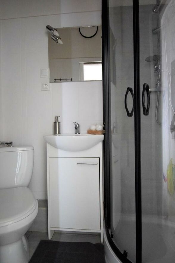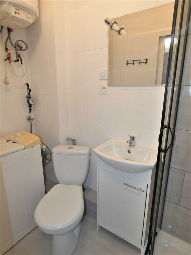 Łazienka: kabina prysznicowa, WC, umywalka, pralka.
