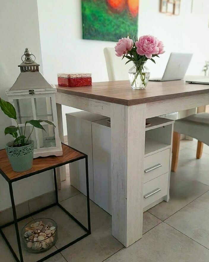 • Design: Białe, masywne nogi zapewniają pełną stabilność, a blat w kolorze dębu nadaje wnętrzu ciepła.