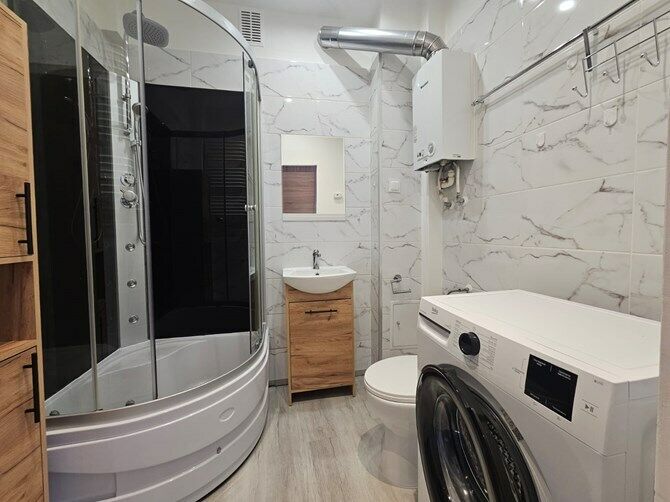 Łazienka z WC: Prysznic, umywalka, pralka, szafka, lustro.